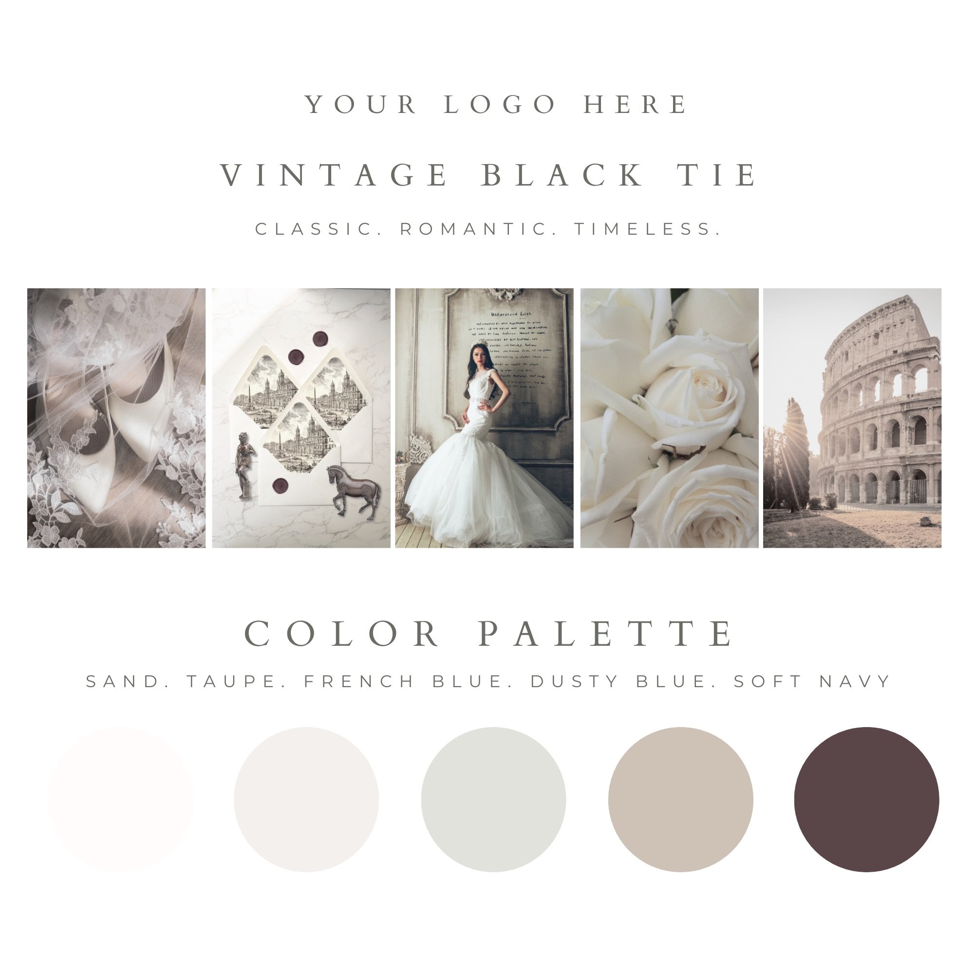 We meet via phone call or Zoom to talk about your vision and I send you a vision board based on what you share. Here’s an example of a design board for a Vintage Black Tie wedding in Rome: